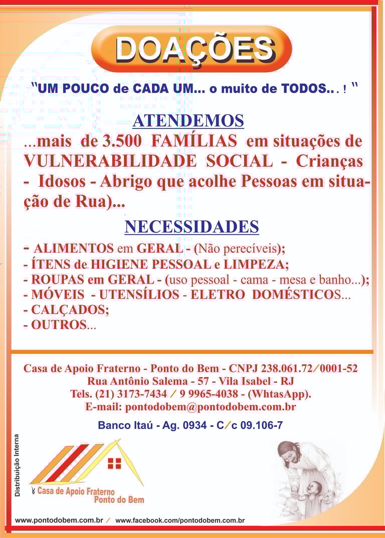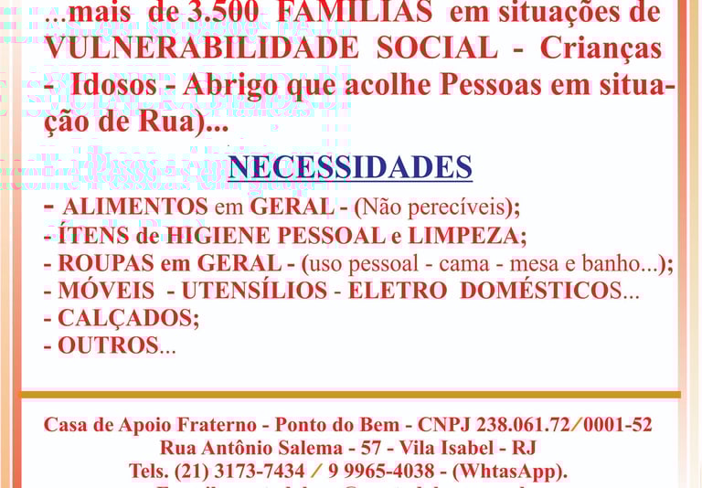 There are MANY SOLIDARY PROJECTS - of SUPPORT and AID with more than 2.500 (two thousand and five hundred) families registered... besides the houses of shelter for people living on the streets and also of shelter for the elderly...!